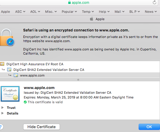 Change the trust settings of a certificate. In the Safari app on your Mac look for an encryption icon in the Smart Search field. If the procedure concludes with the last certificate in the path without errors then the path is accepted as valid.